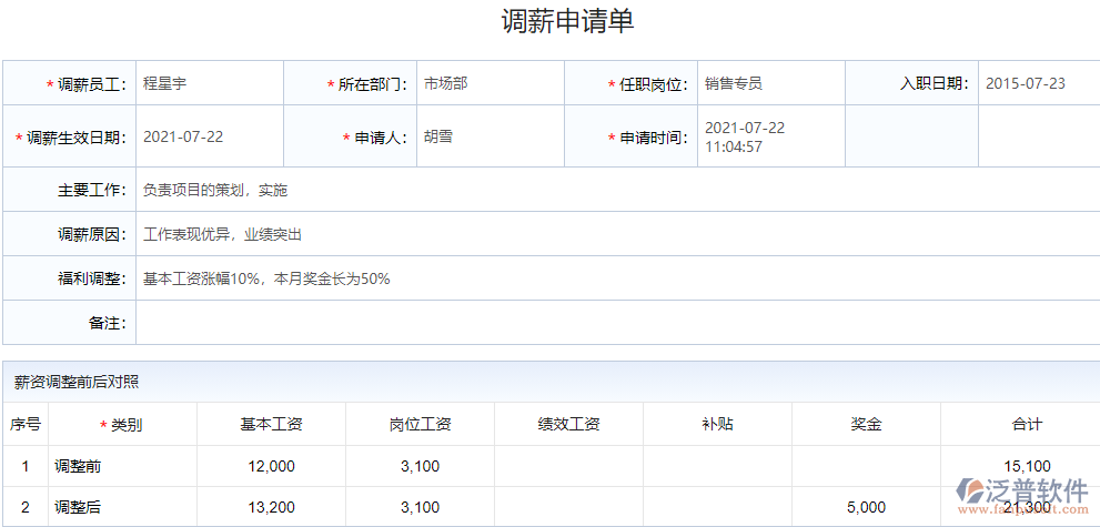 1、在泛普ERP管理系統(tǒng)當(dāng)中,領(lǐng)導(dǎo)或者員工都可以直接在調(diào)薪申請當(dāng)中進(jìn)行填寫保存提交審批,將具體信息以電子規(guī)范化的傳遞和保存,保證了信息的完整性和真實(shí)性。