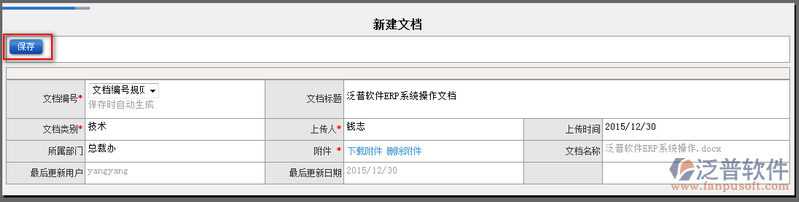 文檔如何在系統(tǒng)中進行保存呢?ERP系統(tǒng)提供了【新建文檔】功能模塊,在此模塊中主要對公司或者部門的文檔進行保存。新建文檔主要屬性包括:文檔編號、文檔類別、上傳人、上傳附件、文檔名稱等相關(guān)信息填寫。