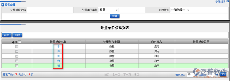 5、創(chuàng)建好的計(jì)量單位信息會(huì)以列表的模式顯示在主頁(yè)面中。如圖: