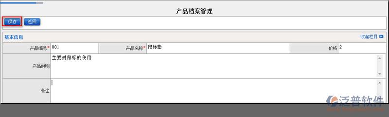 2、點(diǎn)擊【新建】便可進(jìn)入產(chǎn)品信息的新增頁(yè)面中。填寫完相關(guān)信息,點(diǎn)擊【保存】即可。如圖: