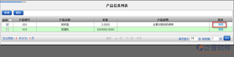 4、創(chuàng)建好的產(chǎn)品信息,ERP系統(tǒng)以為用戶提供修改權(quán)限。選中需要編輯的產(chǎn)品名稱,點(diǎn)擊【編輯】。如圖: