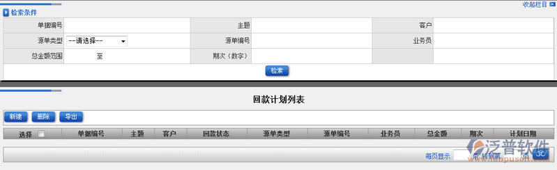 2、通過上圖中的檢索條件用戶可以快速查找到相應(yīng)的回款計(jì)劃。其中檢索條件越多查詢到的結(jié)果越準(zhǔn)備。如圖: