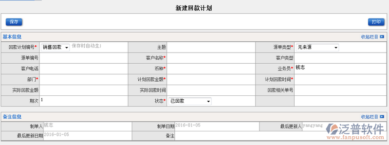 2、填寫完回款計劃中的相關(guān)信息,點擊【保存】便可完成新建回款計劃的創(chuàng)建。新建頁面中紅色標示為必填選項。如圖: