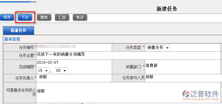 4、保存好的指派任務,就可以對相應的人員進行【下達】操作。如圖:
