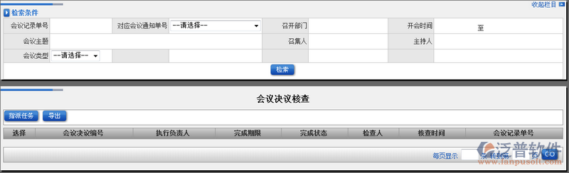 會議決議核查主要對會議討論的結果進行查詢操作。會議中討論出的結果是否執(zhí)行到位。如果還未執(zhí)行,即可通過【會議決議核查】界面對其進行指派任務操作。會議決議核查可以通過以下屬性進行模糊查看,如:會議記錄單號、對應會議通知單號、召開部門等相關信息進行模糊查看。