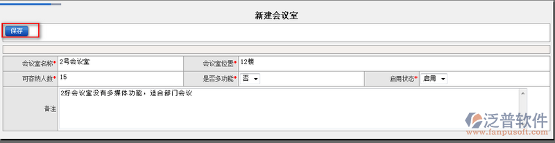 2、填寫完相應(yīng)的信息,點擊【保存】即可完成新會議室的創(chuàng)建。如圖: