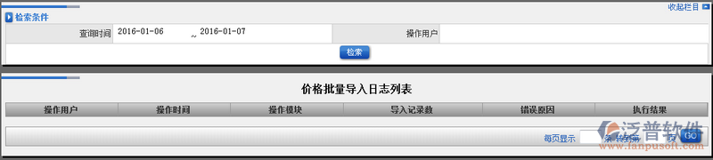 所有的價格通過導(dǎo)入的數(shù)據(jù)都會在系統(tǒng)中留有痕跡,方便后期查詢。價格批量導(dǎo)入日志可以通過系統(tǒng)提供的:查詢時間、操作用戶進行查詢