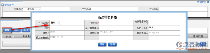 2、點(diǎn)擊上圖中的【新建】進(jìn)入零售價(jià)格新增頁面。如圖: