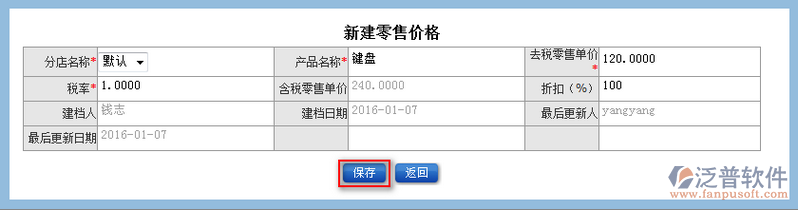 3、填寫完零售價(jià)格中的相關(guān)信息,點(diǎn)擊【保存】即可完成零售價(jià)格的新增。如圖: