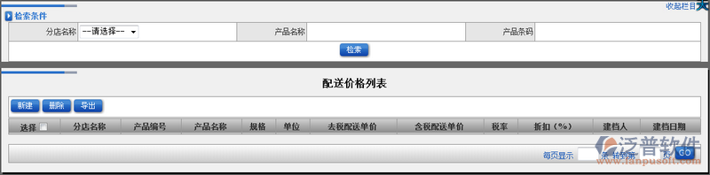1、點擊【配送價格設(shè)置】進入主界面,在此頁面中可以看到檢索條件。如圖: