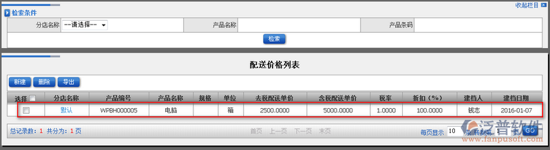 配送價格可能會低于零售價格,采購數(shù)量多的情況下,便可使用配送價格。配送價格相比整體價格有一定的優(yōu)惠。配送價格設(shè)置提前對產(chǎn)品價格進行設(shè)置。其中包含的主要屬性有:分店名稱、產(chǎn)品名稱、去稅配送單價、稅率