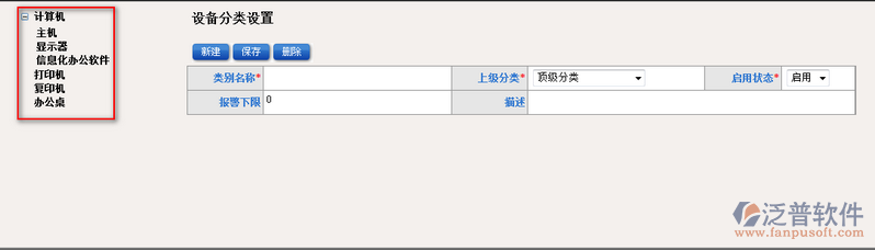 設(shè)備分類設(shè)置功能主要對公司的硬件設(shè)備進行管理,比如:主機、顯示器、打印機等相關(guān)設(shè)置的管理分類。設(shè)備分類設(shè)置主要包含的屬性有:類別名稱、啟動狀態(tài)、報警下限等相關(guān)信息。