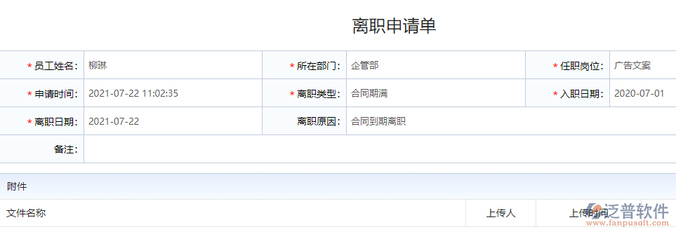 3、在系統(tǒng)中,員工可以將提交的紙質(zhì)辭呈或者相關(guān)的離職手續(xù)等通過附件的形式上傳,電子化的傳送方式和保存方式省去了手工整理存放的麻煩,并且在后期查詢的時候只需要簡單的輸入幾個查詢條件就可以查看了。