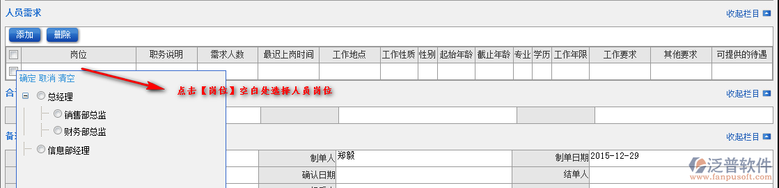2.在人員需求處點(diǎn)擊【添加】人員需求明細(xì)