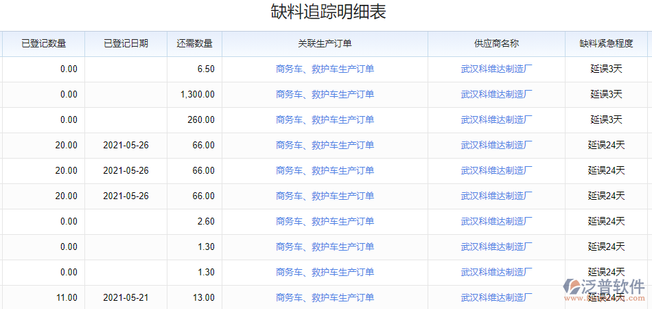 3、根據(jù)生產(chǎn)訂單對應(yīng)的交貨周期,泛普ERP會自動匯算目前缺料的緊急程度。物料部門管理員通過查看列表的計算值得知部門的生產(chǎn)交付時間,對較緊急的缺料訂單加快補料。