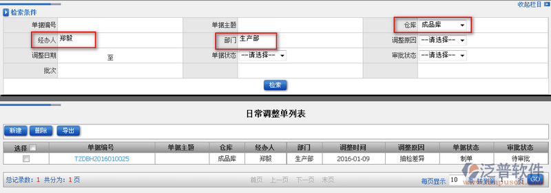 2、通過上圖中的檢索條件,用戶可根據(jù)自己的需求快速查詢到日常調(diào)整單列表中的信息。如圖: