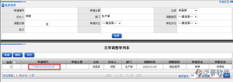 3、查詢出的調(diào)整單都會以列表的形式顯示在其中,點擊表單中的【單據(jù)編號】進入查看。如圖: