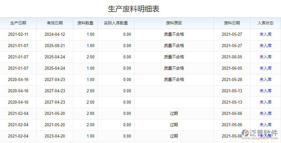 1、泛普ERP自動匯總了所有入庫的生產(chǎn)廢料單,具體的廢料原因也有對應(yīng)的顯示。