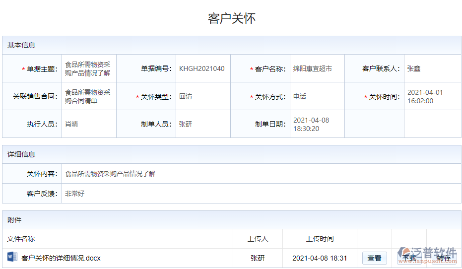 1、系統(tǒng)中通過客戶回訪和關(guān)懷定期對客戶進行跟進處理,建立交流通道,提高客戶的回頭率和減少客戶的流失情況。