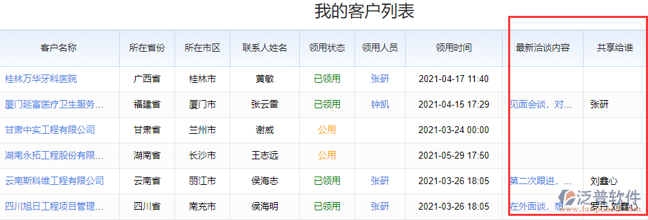 1、【我的客戶(hù)】這個(gè)表可以直觀的查看關(guān)于當(dāng)前銷(xiāo)售人員所有的客戶(hù),別人共享給當(dāng)前用戶(hù)的客戶(hù)、自己領(lǐng)用的客戶(hù)、以及設(shè)置為公用的客戶(hù)都可以在當(dāng)前表中查詢(xún)所有與當(dāng)前用戶(hù)相關(guān)的客戶(hù)
