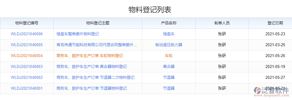 1、泛普ERP將每一張物料登記的單據(jù)都匯總到物料登記列表中。