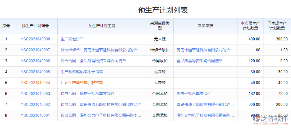 (2)通過(guò)預(yù)生產(chǎn)計(jì)劃列表,可以看到所有的預(yù)生產(chǎn)計(jì)劃單據(jù),每張單據(jù)一共需要生產(chǎn)多少,有多少已經(jīng)生成了正式的生產(chǎn)計(jì)劃等等,幫助生產(chǎn)部快速確定工作任務(wù),合理安排生產(chǎn)。