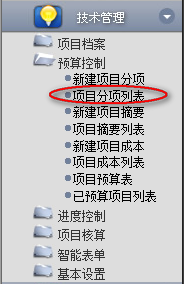點擊辦公模式→技術(shù)管理→預算控制→項目分項列表,進入“項目分項列表”窗口:
