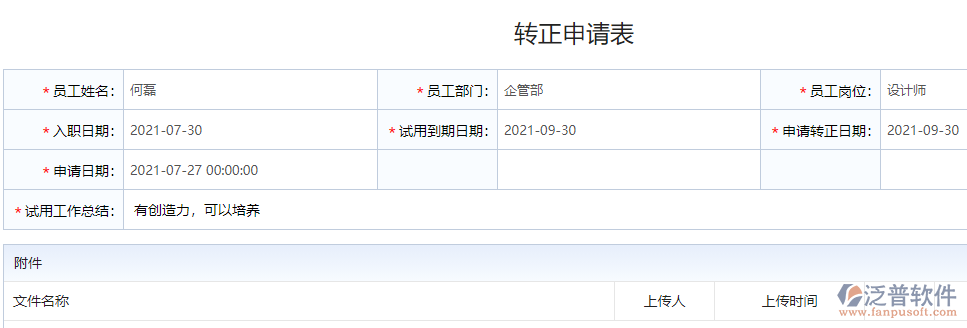 3、將轉(zhuǎn)正需要的文件通過(guò)附件的形式上傳到系統(tǒng)中,避免在遞交審核的過(guò)程中出現(xiàn)混淆或者丟失的情況。