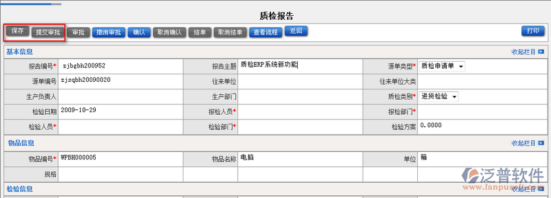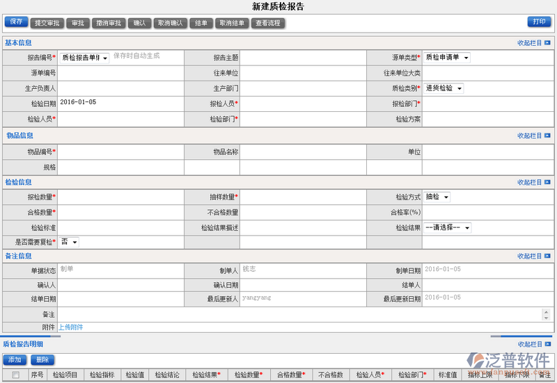 質(zhì)檢申請通過之后,企業(yè)質(zhì)檢人員便可對相應(yīng)的質(zhì)檢得出結(jié)論。這時(shí)就會需要用到ERP系統(tǒng)中的一個(gè)新功能—【新建質(zhì)檢報(bào)告單】,新建質(zhì)檢報(bào)告單主要對質(zhì)檢出的結(jié)果進(jìn)行一個(gè)審批,讓企業(yè)領(lǐng)導(dǎo)放心此產(chǎn)品是否能推廣銷售。新建質(zhì)檢報(bào)告單主要包含的屬性有:質(zhì)檢報(bào)告明細(xì)、報(bào)告編號、報(bào)檢人員、檢驗(yàn)部門等信息為必填項(xiàng)