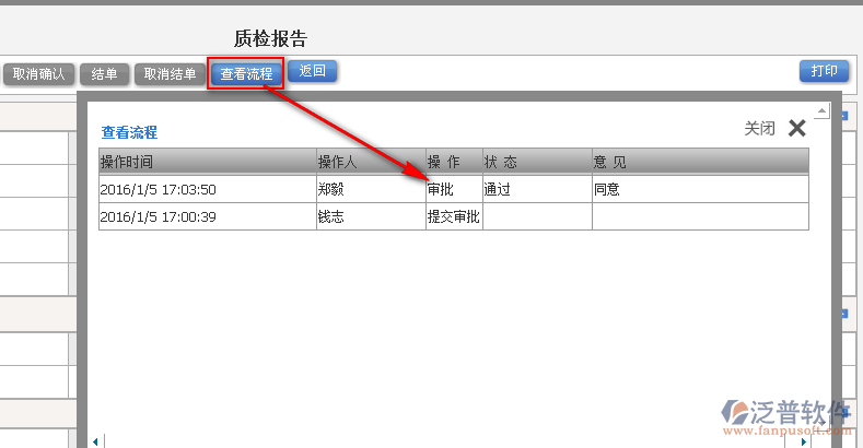 3、提交審批的質(zhì)檢報(bào)告點(diǎn)擊【查看流程】進(jìn)入審批狀態(tài)查看。如圖: