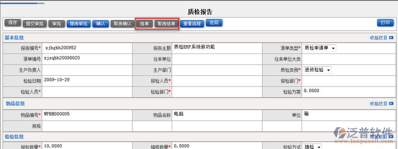 5、確認(rèn)后的質(zhì)檢報(bào)告便可進(jìn)行【結(jié)單】操作,如圖: