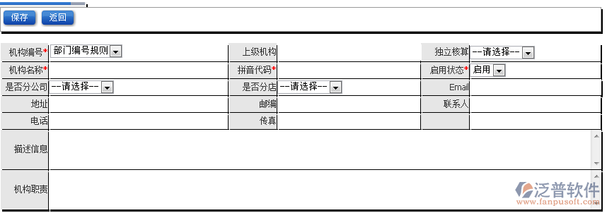 剛部署的系統(tǒng)是沒有任何組織信息的,點擊【新建】建立公司組織架構(gòu),“上級機構(gòu)”不填寫那么新建的公司就作為集團公司,可在它下面新建分、子公司,“啟用狀態(tài)”選擇“啟用”