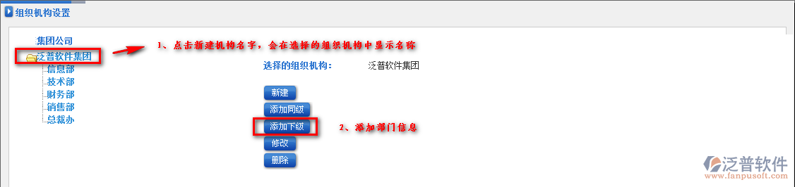 2.集團總部新建以后,點擊【添加下級】設(shè)置部門(信息部、技術(shù)部、財務(wù)部、銷售部、總裁辦)