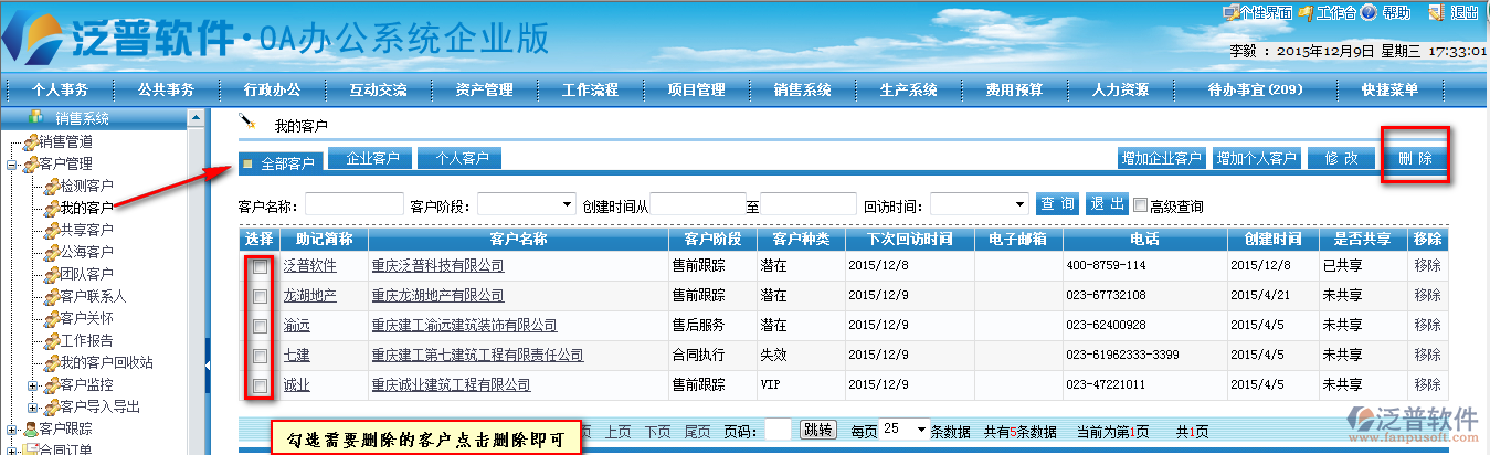 首先如何刪除不需要的客戶信息,進(jìn)入【銷售系統(tǒng)】—【客戶管理】—【我的客戶】