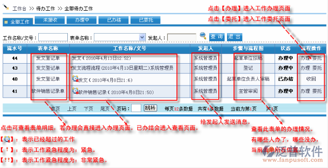 首先進入到【工作流程】-【待辦工作】頁面?!敬k工作】中顯示的是未轉(zhuǎn)交到下一步驟的所有工作。