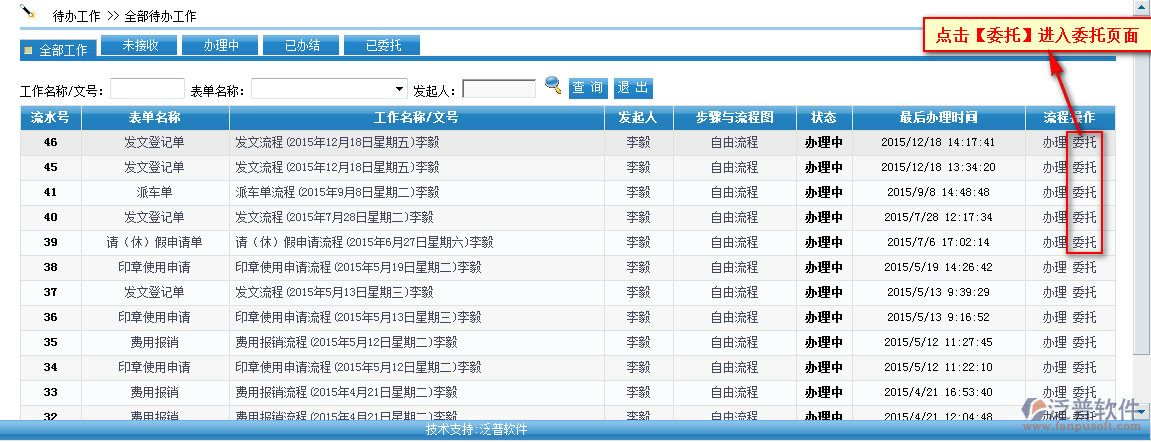 您可以在【工作流程】—【待辦工作】中設(shè)置每項工作的委托人,如圖: