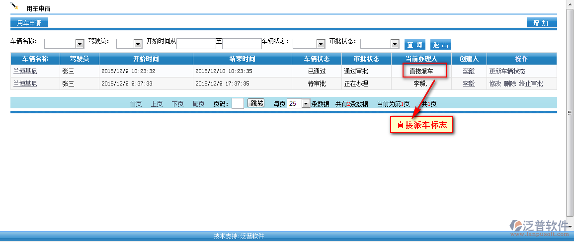 添加后的【直接派車】會在用車申請中顯示,通過審批狀態(tài)可以查看