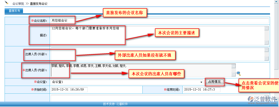 點擊【直接發(fā)布】可以進入新增會議頁面,不同點在于直接發(fā)布不需要審批