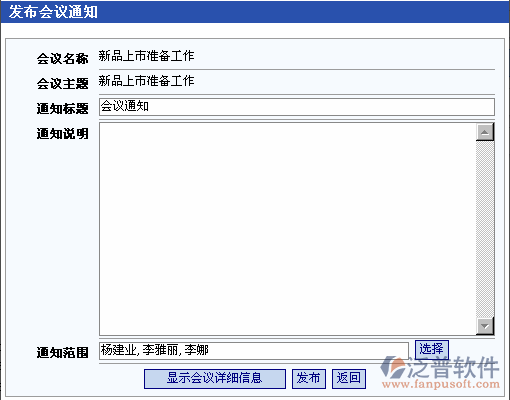 在此頁面中,可點(diǎn)擊[發(fā)布通知]按鈕進(jìn)入發(fā)布通知頁面再次向與會(huì)人員發(fā)送會(huì)議通知。