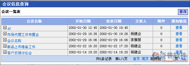 點(diǎn)擊[查詢]可按指定的查詢條件(會(huì)議主題、會(huì)議名稱、會(huì)議說明、會(huì)議日期等)查詢顯示有關(guān)會(huì)議。