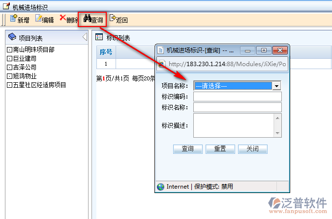 5、在機械進場標識中可可通過【查詢】按鈕進行模糊查詢操作??焖俨樵兊较嚓P(guān)信息。如圖: