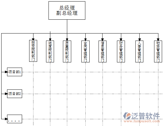 該施工單位為矩陣式組織,所以其分為縱向部門與橫向部門。施工管理軟件縱向部門可以包括投資控制部門、進(jìn)度控制部門、質(zhì)量控制部門、合同管理部門、信息管理部門、人事管理部門、財(cái)務(wù)管理部門和物資管理部門。橫向工作部門可以是各子項(xiàng)目的項(xiàng)目管理部。其部門組織結(jié)構(gòu)形式如下圖所示: