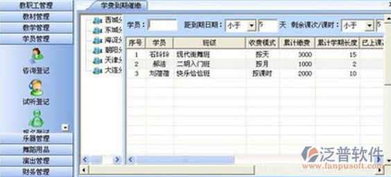 2、 招生方面泛普軟件應用網絡資源(網站與軟件結合)平臺,使學校的招生率節(jié)節(jié)攀升;學校的消息動態(tài)時效的反饋給家長。應用招生模塊,把每天來電來訪的家長及通過什么方式獲悉學校并前來咨詢、以及是否給予優(yōu)惠價格等情況逐一記錄保存,再復電確認學生是否能夠來校學習和參加試聽課程,亦可從中有效地發(fā)掘更多的學生;因各種原因暫時不能來學校上課的學生(潛在的學生),記錄下學生的情況和溝通過程,方便今后的查詢以及進行電話跟蹤,直到發(fā)展成為在校學生,讓學校不管是不是處在招生高峰期都能夠生源不斷。