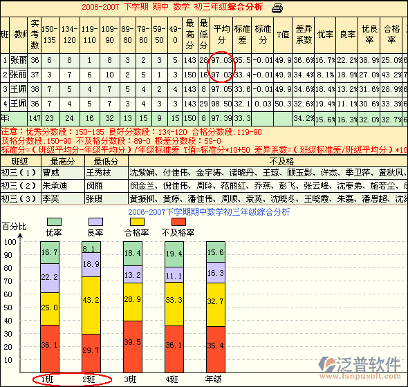 ?、俪R?guī)分析—群體優(yōu)良率頻數(shù)分析:綜合分析班級各分數(shù)段、最高分、最低分、平均分、標準分、T值、優(yōu)良率等信息分析圖中 1班和2班,兩個班級的平均分一樣,但各班級的學生結構有很大不同。1班兩極分化現(xiàn)象較嚴重,優(yōu)生和不及格學生都較多,因而1班教學應適當補差;2班居中度比較高,良和合格學生分布學生較多,但優(yōu)秀學生相對教少,因而2班教學應適當提優(yōu)。