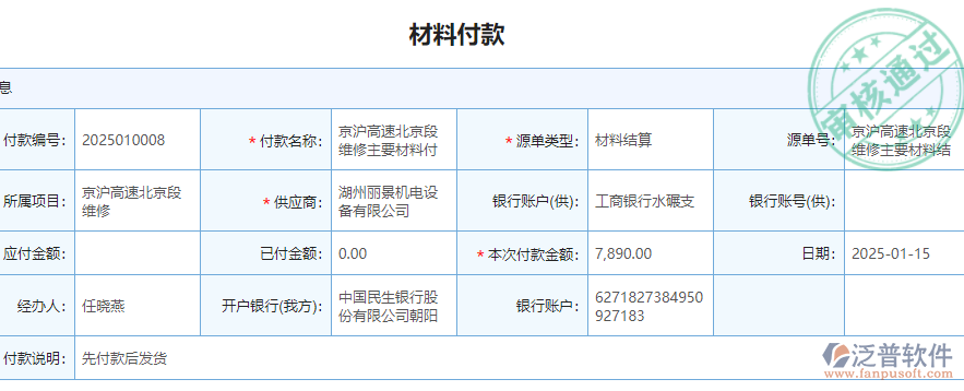 5、在項目材料付款的業(yè)務審批方面,可以實行項目各個申請的全流程管理,提供統(tǒng)-標準的平臺。其中材料付款表單中還能實現(xiàn)自定義審批、多級審批經辦人員填寫后提交財務部領導、項目部領導,公司領導審核簽字,既能實現(xiàn)各部門之間職責的牽制與合作也進一步保證了單據(jù)內容的準確性和合理性。
