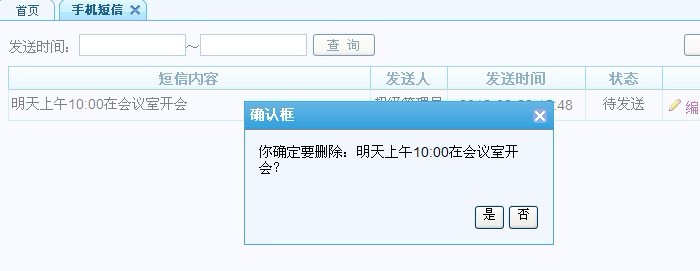 點(diǎn)擊短信后面的“編輯”鏈接,彈出短信發(fā)送窗口,可以修改發(fā)送的時(shí)間、編寫短信內(nèi)容和接受號(hào)碼等信息。