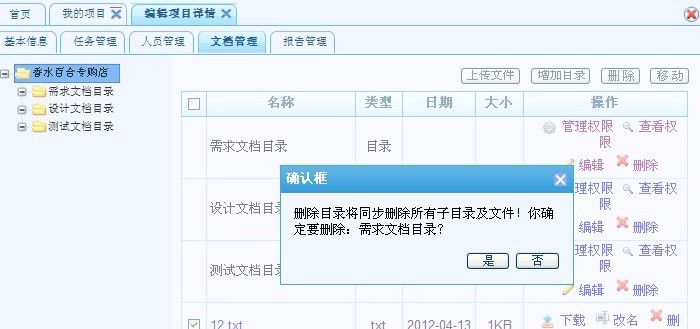 文檔管理,包括項(xiàng)目管理權(quán)限、查看權(quán)限的設(shè)置,以及刪除文檔目錄等。