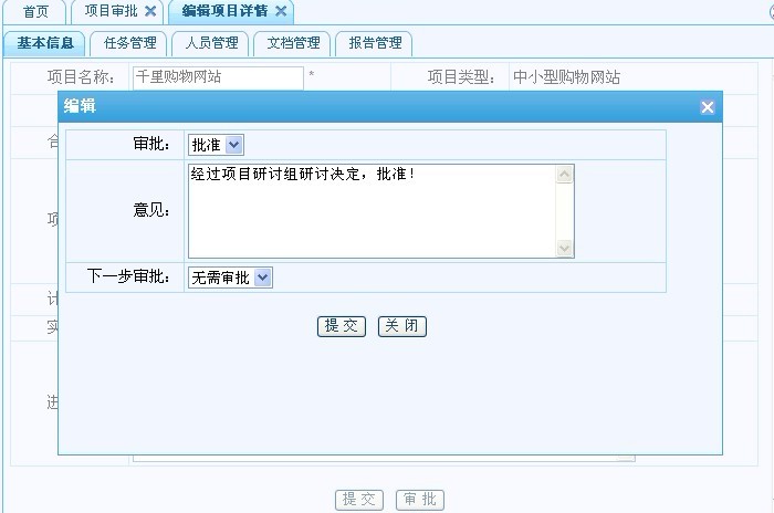 點擊某條申請信息“項目詳情”按鈕顯示申請信息詳情,再點擊“審批”,對項目進行審批。