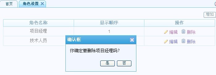 刪除項目已存在角色,點擊某個角色后面的“刪除”按鈕,彈出刪除確認窗口進行二次確認。