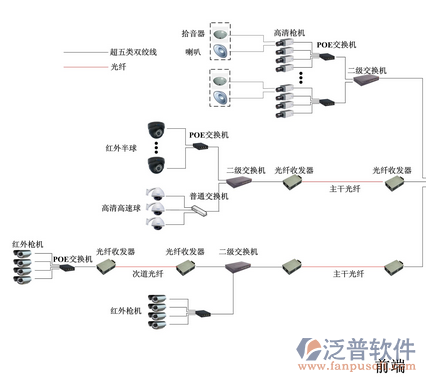 由于前段采用的都是網絡攝像機,傳輸通過現(xiàn)有的別墅局域網絡就可以,不需要另外布線,由于路數(shù)比較少,網絡采用百兆的帶寬就可以了。前段設備的供電采用就近取電方式,通過配套的電源適配器給攝像機供電就可以了。
